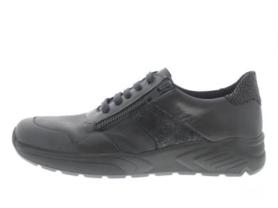 Solidus profylaxe dames sneaker met een ‘chunky’ afwikkelzool en een rits voor het instapgemak, model Hills F uit de Solicare Soft lijn. Met een ‘stretch’ meeverend voorblad voor een extra zachte en voelbaar stiknadenvrije teenbox, perfect voor het ontlasten van pijnlijke voeten bij diabetische en reumatische klachten en bunions. Zwart glad leer gecombineerd met neopreen. Wijdte F, geschikt voor de smalle voet. Uitneembaar voetbed.
