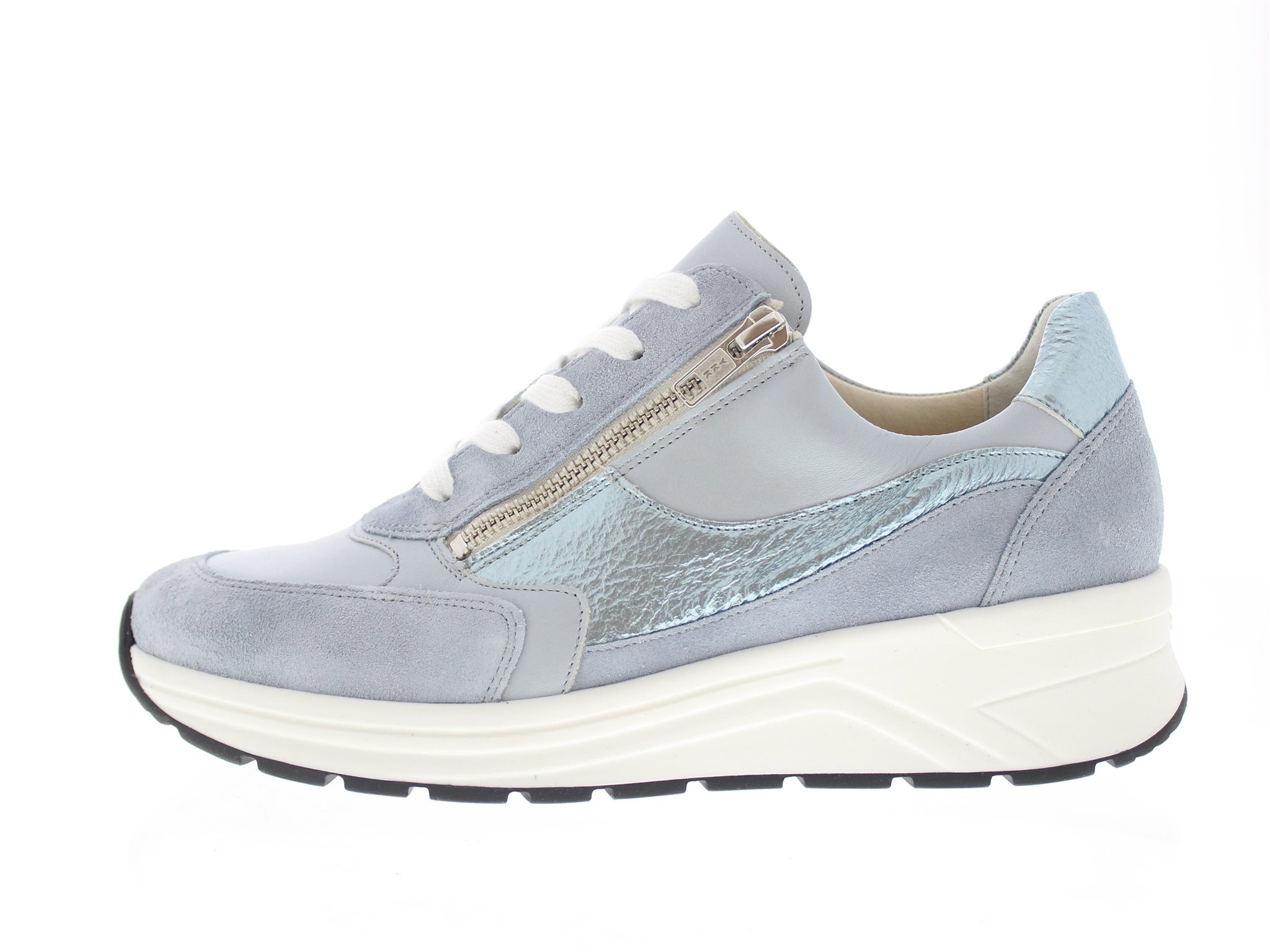 Solidus dames sneaker, model Holly. Uitgerust met een stevige afwikkelzool en een behoorlijke torsiestijfheid. Het brede draagvlak in combinatie met de sterke contrefort zorgen voor veel stabiliteit. Ideale schoen bij een hallux valgus vanwege een royalere balwijdte en toegeknepen hielslot, terwijl de hielheffing je voetwortel centreert. Complete casual schoen waar je makkelijk lange afstanden mee maakt voor je stedelijke wandeling, winkelen of bij het doen van je boodschappen. Super comfortabel vanwege de 3D demping van de buitenzool, tussenlaag en dempende elementen van het uitneembare voetbed. Licht blauw leer met suède. Wijdte H, geschikt voor de iets bredere voet. De rits is functioneel. Uitneembaar voetbed. Hakhoogte 45mm. Hielheffing 30mm.