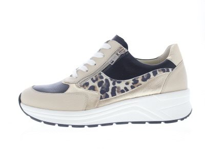 Solidus dames sneaker, model Holly. Uitgerust met een stevige afwikkelzool en een behoorlijke torsiestijfheid. Het brede draagvlak in combinatie met de sterke contrefort zorgen voor veel stabiliteit. Ideale schoen bij een hallux valgus vanwege een royalere balwijdte en toegeknepen hielslot, terwijl de hielheffing je voetwortel centreert. Complete casual schoen waar je makkelijk lange afstanden mee maakt voor je stedelijke wandeling, winkelen of bij het doen van je boodschappen. Super comfortabel vanwege de 3D demping van de buitenzool, tussenlaag en dempende elementen van het uitneembare voetbed. Bruin leer met suède. Wijdte H, geschikt voor de iets bredere voet. De rits is functioneel. Uitneembaar voetbed. Hakhoogte 45mm. Hielheffing 30mm.