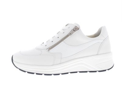 Solidus dames sneaker, model Holly. Uitgerust met een stevige afwikkelzool en een behoorlijke torsiestijfheid. Het brede draagvlak in combinatie met de sterke contrefort zorgen voor veel stabiliteit. Ideale schoen bij een hallux valgus vanwege een royalere balwijdte en toegeknepen hielslot, terwijl de hielheffing je voetwortel centreert. Complete casual schoen waar je makkelijk lange afstanden mee maakt voor je stedelijke wandeling, winkelen of bij het doen van je boodschappen. Super comfortabel vanwege de 3D demping van de buitenzool, tussenlaag en dempende elementen van het uitneembare voetbed. Wit leer. Wijdte H, geschikt voor de iets bredere voet. De rits is functioneel. Uitneembaar voetbed. Hakhoogte 45mm. Hielheffing 30mm.
