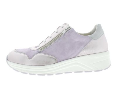 Solidus dames sneaker, model Holly. Uitgerust met een stevige afwikkelzool en een behoorlijke torsiestijfheid. Het brede draagvlak in combinatie met de sterke contrefort zorgen voor veel stabiliteit. Ideale schoen bij een hallux valgus vanwege een royalere balwijdte en toegeknepen hielslot, terwijl de hielheffing je voetwortel centreert. Complete casual schoen waar je makkelijk lange afstanden mee maakt voor je stedelijke wandeling, winkelen of bij het doen van je boodschappen. Roze suède gecombineerd met glad metallic leer en voorzien van een functionele rits. Wijdte H, geschikt voor de iets bredere voet. Uitneembaar voetbed. Hakhoogte 45mm. Hielheffing 30mm.