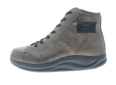 Finn Comfort dames bootie, model Holten uit de super comfortabele Finnamic afwikkel-lijn, ideaal bij het bestrijden van hielspoor/peesplaat en voorvoet gerelateerde klachten (metatarsalgie/morton), en het verbeteren van de lichaamshouding om eventuele rugklachten te verlichten. Zwart reliëf leer met een koper metallic finish.. Valt tussen een wijdte H en K, geschikt voor de bredere voet. Voorzien van een mediale rits voor het aan- en uittrek gemak. Uitneembaar ecologisch en anatomisch gevormde voetbed.