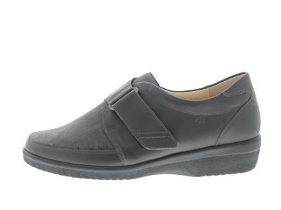Ganter dames klittenbandschoen, model Inge I uit de Sensitiv lijn. Zeer brede pasvorm op een flexibele zool. Klittenbandsluiting met passant voor een extra stevige fit. Zacht gepolsterde kalfsleren voering met velours om drukpunten aan de voet te verlichten. Voorblad is van stretch voor het bestrijden van eeltplekken rond de tenen. Grijs glad leer met neopreen. Wijdte I, geschikt voor de extra brede voet. Uitneembaar voetbed.