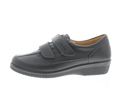 Ganter dames klittenbandschoen, model Inge I uit de Sensitiv lijn. Zeer brede pasvorm op een flexibele zool. Dubbele klittenbandsluiting met passanten voor een extra stevige fit. Zacht gepolsterde kalfsleren voering met velours. Zwart glad leer. Wijdte I, geschikt voor de extra brede voet. Uitneembaar voetbed.