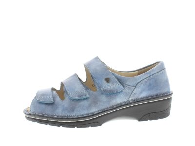 Finn Comfort dames klittenband sandaal, model Ischia uit de LadyLine, jeans blauw glad gevlamd leer, valt als een wijdte H, geschikt voor de normale tot bredere voet, uitneembaar voetbed. Fijne sandaal om de achillespees mee te ontlasten en een gevalgiseerde voetstand te corrigeren.