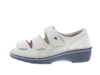 Finn Comfort dames klittenband sandaal, model Ischia uit de LadyLine, met een gesloten hiel en dichte flanken voor een stevige aansluiting rondom de hele voet. Champagne/beige nubuck leer met een metallic finish. Valt als een wijdte H, geschikt voor de normale tot bredere voet. Uitneembaar ecologisch en anatomisch gevormde voetbed. Fijne sandaal om de achillespees mee te ontlasten en een gevalgiseerde voetstand te corrigeren. De Ischia sandalen vallen een halve maat kleiner dan normaal.
