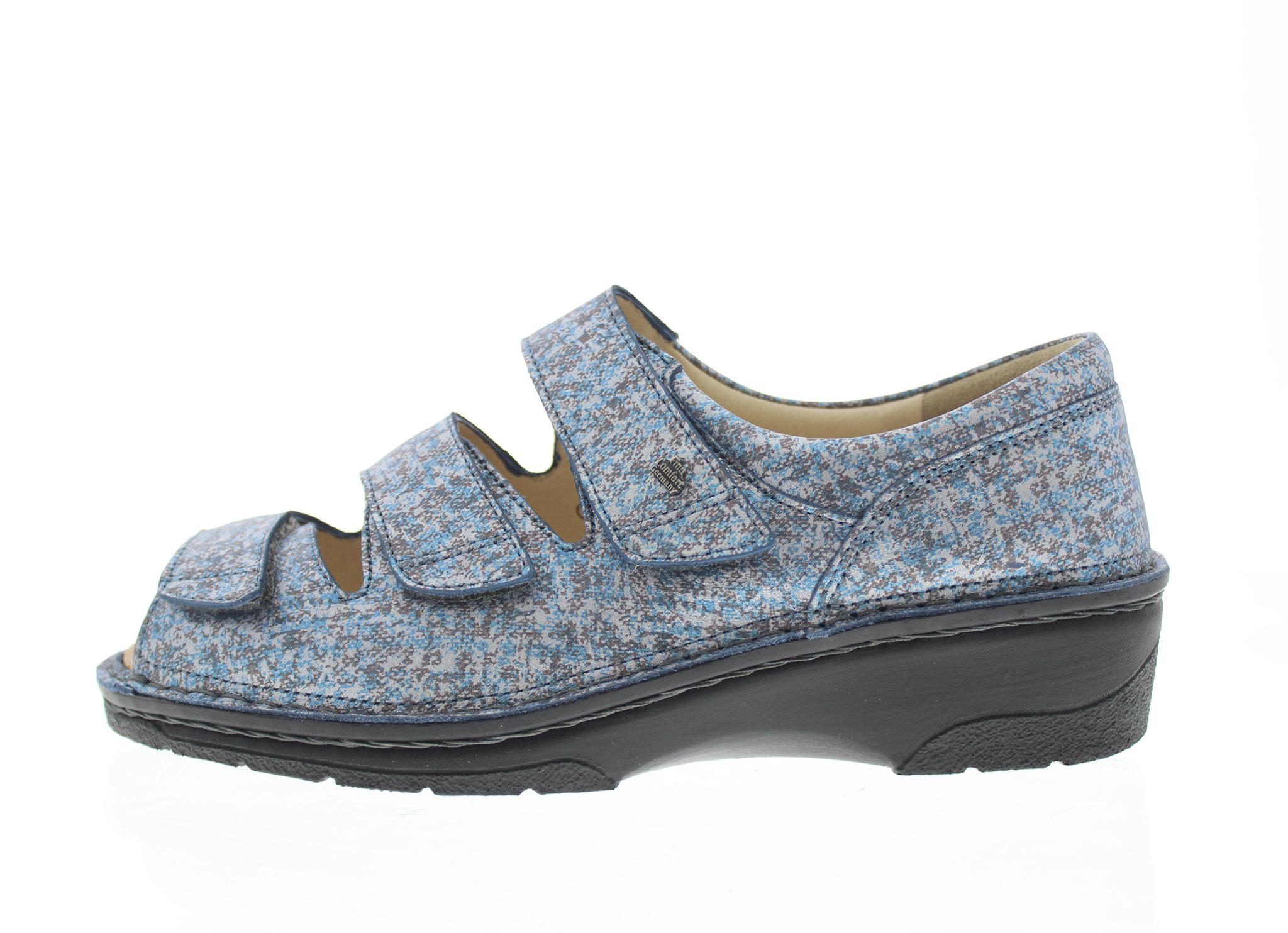 Finn Comfort dames klittenband sandaal, model Ischia uit de LadyLine, met een gesloten hiel en dichte flanken voor een stevige aansluiting rondom de hele voet. Blauw nubuck leer met een patroon en een metallic finish. Valt als een wijdte H, geschikt voor de normale tot bredere voet. Uitneembaar ecologisch en anatomisch gevormde voetbed. Fijne sandaal om de achillespees mee te ontlasten en een gevalgiseerde voetstand te corrigeren. De Ischia sandalen vallen een halve maat kleiner dan normaal.