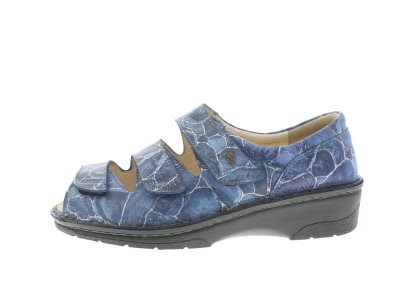 Finn Comfort dames klittenband sandaal, model Ischia uit de LadyLine, blauw glad leer met een metallic effect, valt als een wijdte H, geschikt voor de normale tot bredere voet, uitneembaar voetbed. Fijne sandaal om de achillespees mee te ontlasten en een gevalgiseerde voetstand te corrigeren. Hakhoogte 40mm. Hielheffing 25mm.