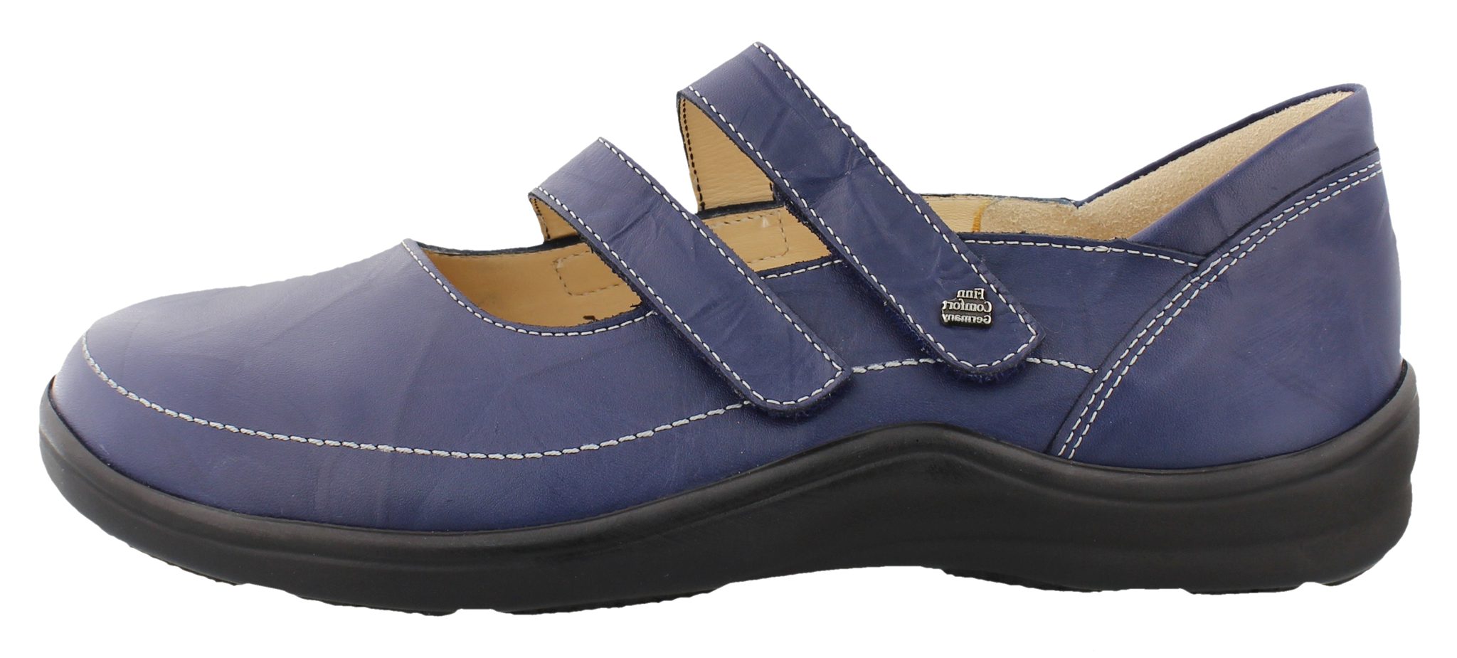Finn Comfort dames bandschoen Jerez, blauw glad leer met dubbele klittenband sluitingen, voor de normale tot brede voet, uitneembare inlegzool, wijdte h, hakhoogte 12 mm.