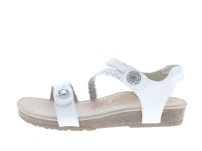 Aetrex dames sandaal, model Jillian Black. Aetrex sandalen zijn voorzien van een ingebouwde ondersteunende voetbed met een lichte correctie om ook het overproneren tegen te gaan. Hierdoor ervaar je meer steun en stabiliteit. Dit zorgt ervoor dat de enkels niet naar binnen knikken, een rechtere lichaamshouding bevordert, en hiel en voorvoet klachten ontlast middels een stimulerende afwikkeling en dempende eigenschappen. Het zachte materiaal neemt enigszins je eigen voetafdruk aan en is zeer comfortabel bij doorgezakte voeten. Uitgevoerd in wit glad leer. Valt als een wijdte H, geschikt voor de normale tot iets bredere voet.