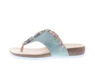 Think! dames slipper, model Julia, groen multi leer, met een kurkgevormde onderwerk met hielkom voor extra enkel en hielstabiliteit. Licht anatomisch gevormde voetbed, valt als een wijdte H, geschikt voor de iets hogere wreef. Dit model heeft een vast voetbed met een natuurlijk gevormde teenlijn. Dit model heeft een allergeenvrije binnenvoering.