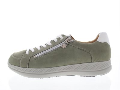 Ganter dames casual sneaker, model KarlaLuise uit de Sensitiv lijn, voorzien van een functionele rits voor het aan- en uittrek gemak. Salie groen nubuck met witte details. Plantaardig gelooide binnenvoering van zacht velours zonder voelbare stiknaden en volledig gepolsterd. Stevige afwikkelzool, zeer geschikt ter ondersteuning bij diabetische, neuropatische en reumatische klachten. Wijdte K-L, geschikt voor de brede tot zeer brede voet. Uitneembaar voetbed, goed te dragen als dagelijkse schoen. Dit model heeft een extra uitneembare opvulzool dat van een wijdte K breedtemaat overgaat naar een wijdte L voor meer comfort. Hakhoogte 44mm. Hielheffing 18mm.