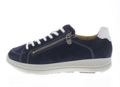Ganter dames casual sneaker, model KarlaLuise uit de Sensitiv lijn, met een EXTRA verstijfde zool ter ondersteuning bij een hallux rigidus/limitus en artrose. Functionele rits voor het aan- en uittrek gemak. Donkerblauw nubuck met witte details. Plantaardig gelooide binnenvoering van zacht velours zonder voelbare stiknaden en volledig gepolsterd. Stevige afwikkelzool, zeer geschikt ter ondersteuning bij diabetische, neuropatische en reumatische klachten. Wijdte K-L, geschikt voor de brede tot zeer brede voet. Uitneembaar voetbed. Goed te dragen als dagelijkse schoen. Dit model heeft een extra uitneembare opvulzool dat van een wijdte K breedtemaat overgaat naar een wijdte L voor meer comfort.