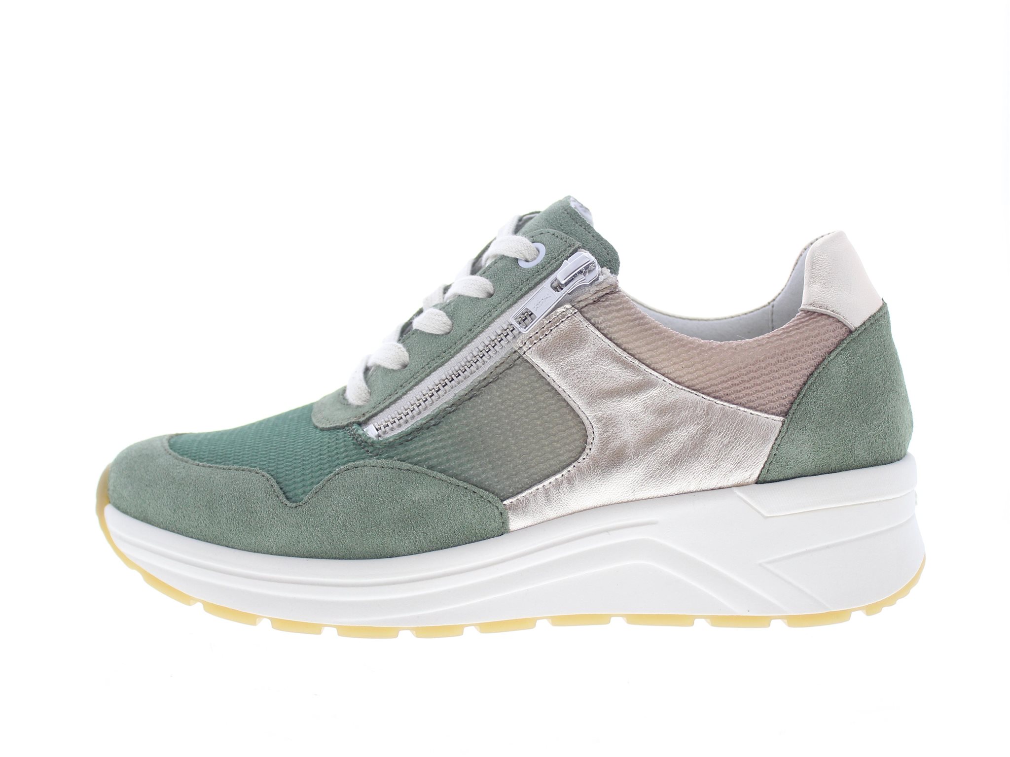 Solidus dames sneaker, model Karma. Dit is een profylaxe uitvoering zonder voelbare stiknaden, geschikt bij diabetische en reumatische voetklachten. Uitgerust met een stevige afwikkelzool en een behoorlijke torsiestijfheid. Het brede draagvlak in combinatie met de sterke contrefort zorgen voor veel stabiliteit. Ideale schoen bij een hallux valgus vanwege een royalere balwijdte en toegeknepen hielslot, terwijl de hielheffing je voetwortel centreert. Complete casual schoen waar je makkelijk lange afstanden mee maakt voor je stedelijke wandeling, winkelen of bij het doen van je boodschappen. Groen met beige suède gecombineerd met mesh. Wijdte K, geschikt voor de brede voet. De rits is functioneel. Uitneembaar voetbed. Hakhoogte 45mm. Hielheffing 30mm.