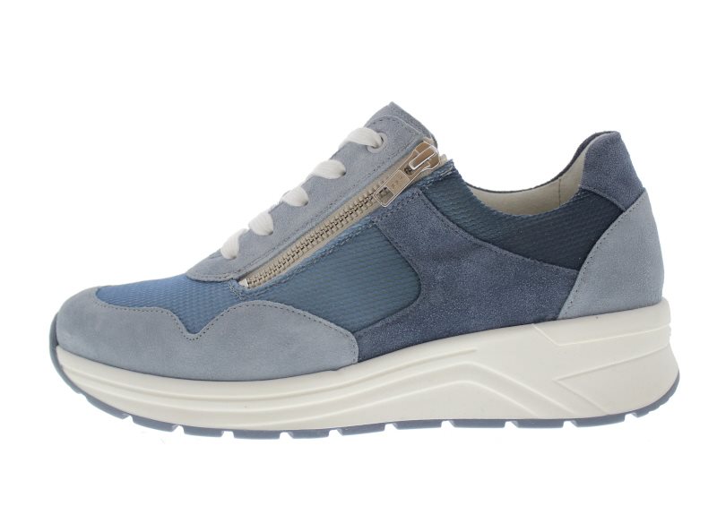 Solidus dames sneaker, model Karma. Dit is een profylaxe uitvoering zonder voelbare stiknaden, geschikt bij diabetische en reumatische voetklachten. Uitgerust met een stevige afwikkelzool en een behoorlijke torsiestijfheid. Het brede draagvlak in combinatie met de sterke contrefort zorgen voor veel stabiliteit. Ideale schoen bij een hallux valgus vanwege een royalere balwijdte en toegeknepen hielslot, terwijl de hielheffing je voetwortel centreert. Complete casual schoen waar je makkelijk lange afstanden mee maakt voor je stedelijke wandeling, winkelen of bij het doen van je boodschappen. Blauw suède gecombineerd met mesh. Wijdte K, geschikt voor de brede voet. De rits is functioneel. Uitneembaar voetbed. Hakhoogte 45mm. Hielheffing 30mm.