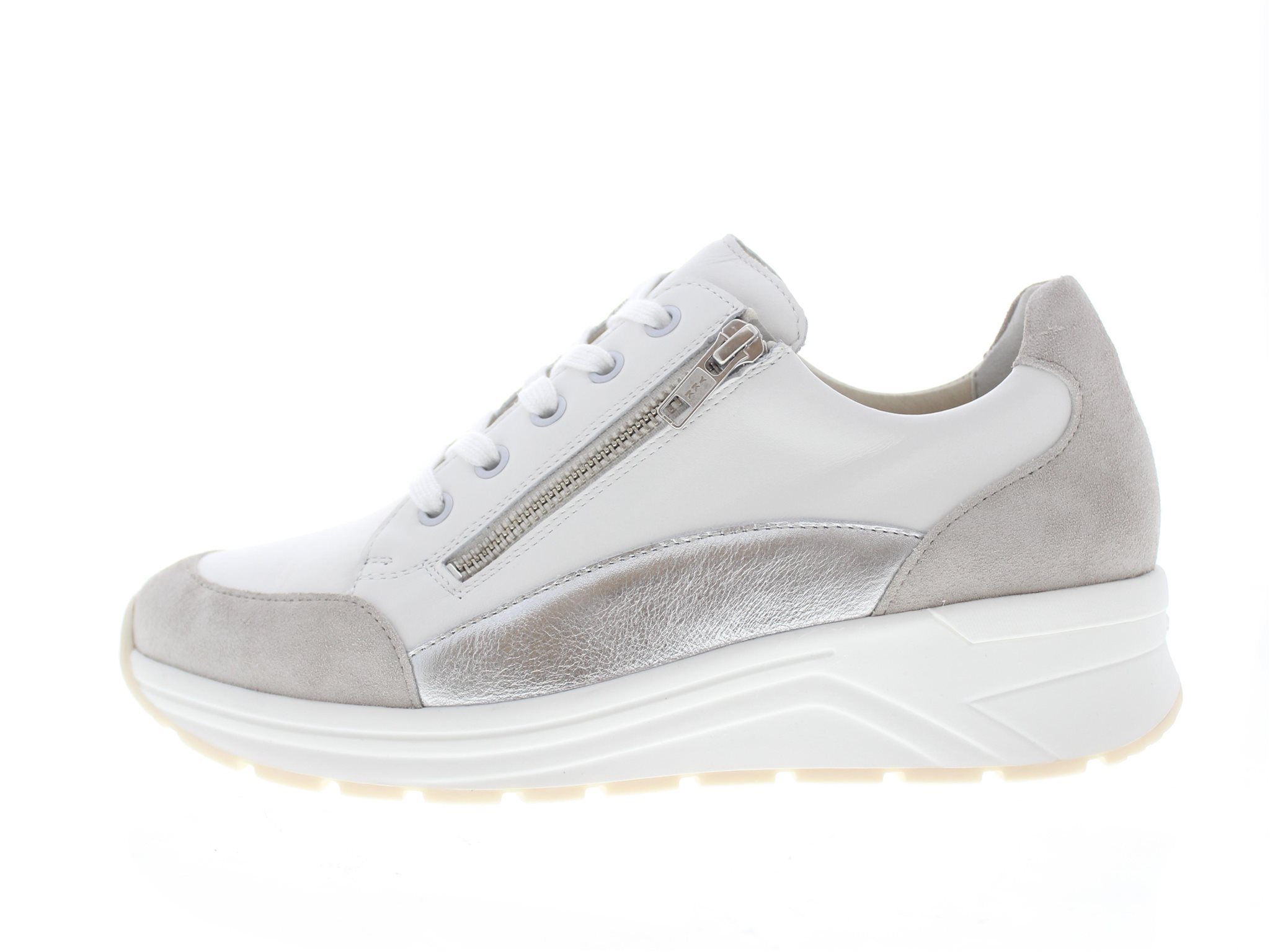 Solidus dames sneaker, model Karma. Uitgerust met een stevige afwikkelzool en een behoorlijke torsiestijfheid. Het brede draagvlak in combinatie met de sterke contrefort zorgen voor veel stabiliteit. Ideale schoen bij een hallux valgus vanwege een royalere balwijdte en toegeknepen hielslot, terwijl de hielheffing je voetwortel centreert. Complete casual schoen waar je makkelijk lange afstanden mee maakt voor je stedelijke wandeling, winkelen of bij het doen van je boodschappen. Wit leer met suède en voorzien van een functionele rits. Wijdte K, geschikt voor de brede voet. Uitneembaar voetbed. Hakhoogte 45mm. Hielheffing 30mm.