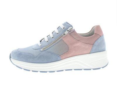Solidus dames sneaker, model Karma. Dit is een profylaxe uitvoering zonder voelbare stiknaden, geschikt bij diabetische en reumatische voetklachten. Uitgerust met een stevige afwikkelzool en een behoorlijke torsiestijfheid. Het brede draagvlak in combinatie met de sterke contrefort zorgen voor veel stabiliteit. Ideale schoen bij een hallux valgus vanwege een royalere balwijdte en toegeknepen hielslot, terwijl de hielheffing je voetwortel centreert. Complete casual schoen waar je makkelijk lange afstanden mee maakt voor je stedelijke wandeling, winkelen of bij het doen van je boodschappen. Blauw met roze suède gecombineerd met mesh. Wijdte K, geschikt voor de brede voet. De rits is functioneel. Uitneembaar voetbed. Hakhoogte 45mm. Hielheffing 30mm.