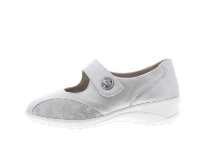 Solidus dames profylaxe bandschoen, model Karo met een klittenband sluiting en stretch materiaal bij de bal van de voet dat wondjes en eelt helpt te voorkomen. Metallic grijs-zilver leer met neopreen, geschikt voor het verlichten van drukpunten van een bunion of hallux valgus, wijdte K voor de brede voet met een verwisselbaar voetbed.