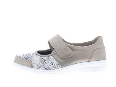 Bandschoen van het merk Solidus is gemaakt van zacht leer uitgevoerd in beige kleur met print. Het voetbed is uitneembaar en hij is gemaakt op een wijdte K. Hakhoogte 35mm en een hieldrop van 22mm.