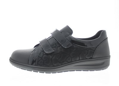Solidus dames casual klittenbandschoen, model Kate. Voorzien van een flexibele afwikkelzool en uitgevoerd met een dubbele klittenbandsluiting met passanten, zodat je deze goed kan fixeren. Zwart leer met lak. Wijdte K, geschikt voor de brede voet, en zeer comfortabel bij een hallux valgus. Uitneembaar voetbed. Hakhoogte 35mm. Hielheffing 22mm.