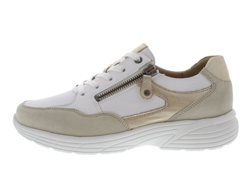 Hartjes dames sneaker, model Katy Shoe. Lichtgewicht ‘EXTRALIGHT’ flexibele loopzool met een stabiele hielpartij. Laterale rits voor het instapgemak. Wit leer, suède en metallic details. Wijdte K met iets meer toegift rond de balwijdte, geschikt voor de brede voet. Uitneembaar voetbed. Dit model is chroomarm.