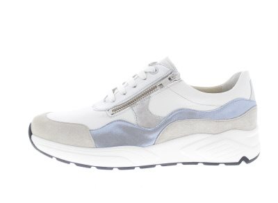 Solidus casual dames sneaker met een ‘chunky’ afwikkelzool, model Kea. Vrij minimalistische rijg molière die een tijdloze uitstraling garandeert,. Voorzien van een functionele rits voor het aan- en uittrek gemak. Wit leer met blauw/grijze zijflanken. Wijdte K, geschikt voor de brede voet. Uitneembaar voetbed. Hakhoogte 38mm. Hielheffing 18mm. Impregneren met Collonil Carbon Pro, zo zijn ze beschermt en blijven ze langer mooi.