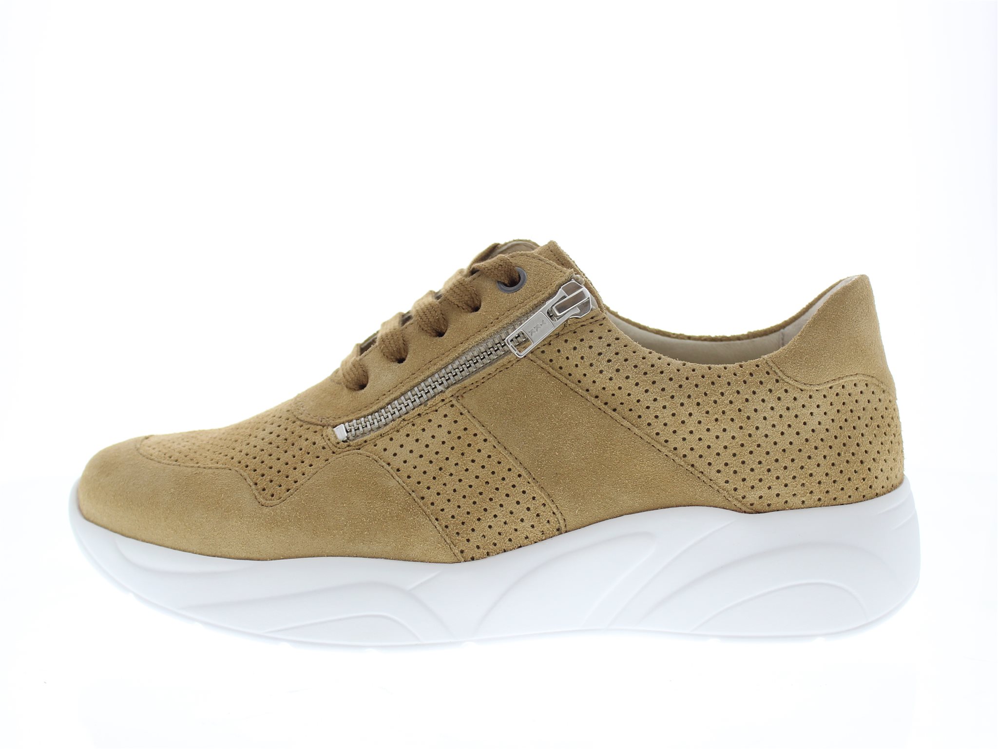Solidus casual dames sneaker met een ‘chunky’ afwikkelzool, model Kea. Vrij minimalistische rijg molière die een tijdloze uitstraling garandeert. Voorzien van een functionele rits voor het aan- en uittrek gemak. Camel suède. Wijdte K, geschikt voor de brede voet. Uitneembaar anatomisch gevormde voetbed. Hakhoogte 38mm. Hielheffing 18mm. Impregneren met Collonil Carbon Pro, zo zijn ze beschermt en blijven ze langer mooi.