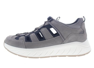 Solidus heren sandaal, model Ken. De Ken is een veelzijdige leest qua look en functie. Door de verstijfde loopzool met een versnelde afwikkeling, rol je makkelijk je voeten af bij een gelimiteerde functie van het grote teengewricht. Ook voordelig bij voorvoet en peesplaat gerelateerde klachten. Dit model is uitgevoerd in een H/K combinatie, dus het valt als een wijdte H, maar met de extra uitneembare binnenzool vergroot je de volume tot een wijdte K. Grijs/taupe nubuck. voorzien van een ingebouwde elastische veter.