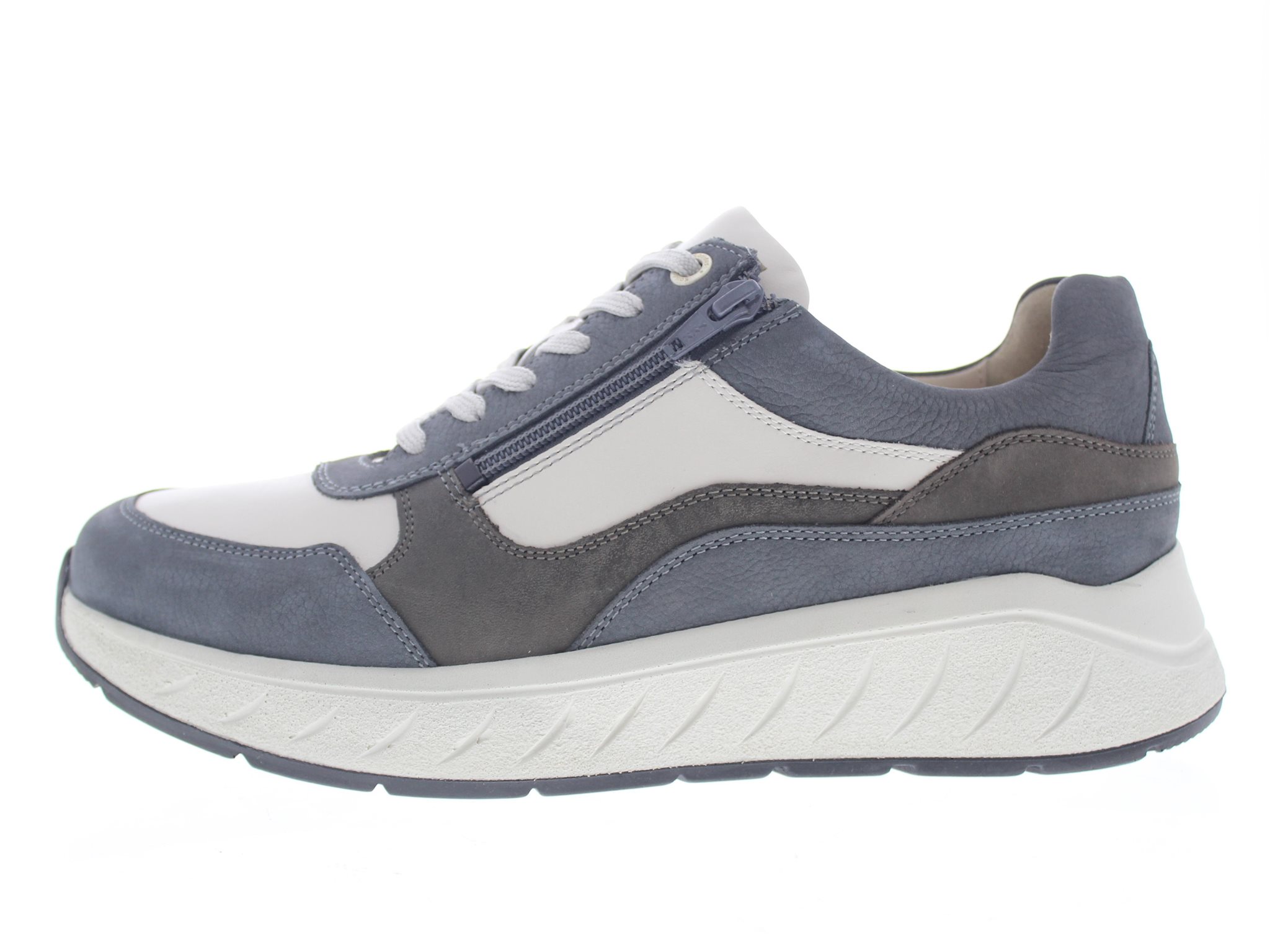 Solidus heren sneaker, model Ken. De Ken is een veelzijdige sneaker qua look en functie. Door de verstijfde loopzool met een versnelde afwikkeling, rol je makkelijk je voeten af bij een gelimiteerde functie van het grote teengewricht. Ook uitermate geschikt bij voorvoet en peesplaat gerelateerde klachten. Dit model is uitgevoerd in een H/K combinatie, dus het valt als een wijdte H, maar met de extra uitneembare binnenzool vergroot je de volume tot een wijdte K. Staalblauw met wit leer en nubuck. Voorzien van een laterale rits voor extra comfort bij het uit en aantrekken van de schoen. Hakhoogte 45mm. Hielheffing 20mm.