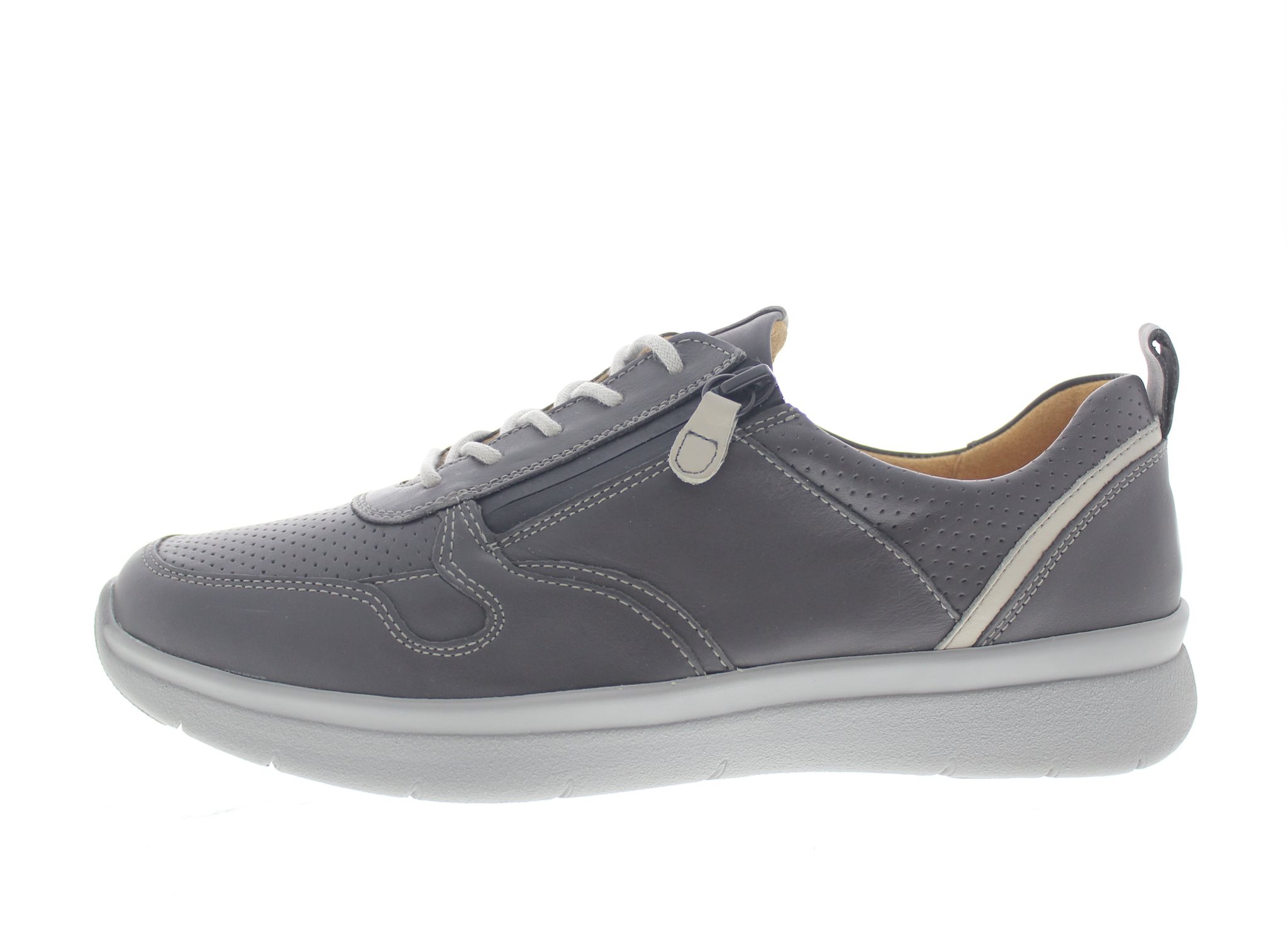 Ganter dames sneaker, model Kira uit de Vario-Sensitiv lijn, volledig gepolsterd voor de gevoelige voet. De flexibel rubberen afwikkelzool zorgt voor een aangename demping. Functionele rits voor aan- en uittrek gemak. Grijs leer. Wijdte K, geschikt voor de brede voet. Voorzien van een uiterst aangenaam zachte voetbed dat eventueel uitneembaar is voor een paar eigen steunzolen.