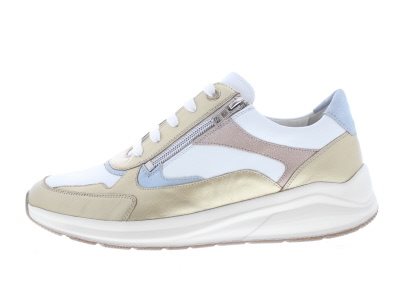 Solidus dames sneaker, model Kitty uit de Variofit lijn. Dit is een profylaxe uitvoering zonder voelbare stiknaden, geschikt bij diabetische en reumatische voetklachten. Voorzien van een flexibele loopzool met een licht afrollend effect en een groot draagvlak. De verlengde contrefort en de redelijke torsiestijfheid ondersteunen de hiel en middenvoet. Dit samen zorgt voor een soepele looppatroon met een rechte afwikkeling waar je niet bij na hoeft te denken en volop kan genieten van stads- en wandel omgeving. Ideale schoen bij een hallux valgus vanwege een royalere balwijdte en toegeknepen hielslot, terwijl de hielheffing je voetwortel centreert. Complete casual schoen waardoor je wandelingen langer volhoudt. Goud met wit leer. Dit model heeft een dubbel uitneembaar voetbed dat van een H breedte maat overgaat in een wijdte K, dus dubbel functioneel en extra comfortabel! Geschikt voor de iets bredere tot brede voet. De rits is functioneel. Uitneembaar voetbed.