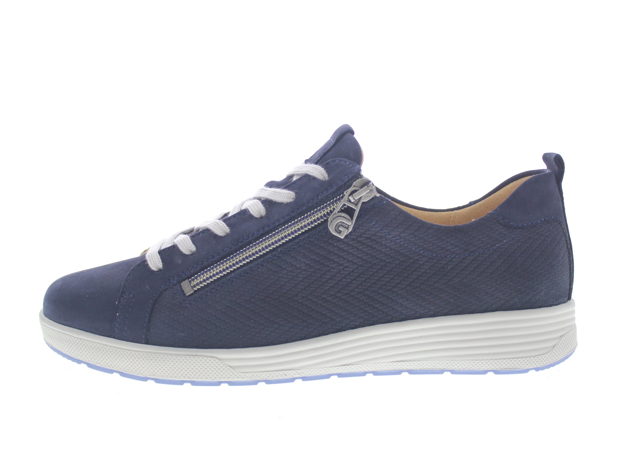 Ganter dames minimalistische sneaker, model Klara uit de Sensitiv lijn. Blauw nubuck met een zachte binnenvoering en een rits voor het instap gemak. De flexibele loopzool zorgt voor een neutrale en natuurlijke afwikkeling van je eigen voet. Wijdte K, geschikt voor de brede voet. Uitneembaar voetbed. Goed te dragen als dagelijkse schoen voor mensen met weinig voetklachten.