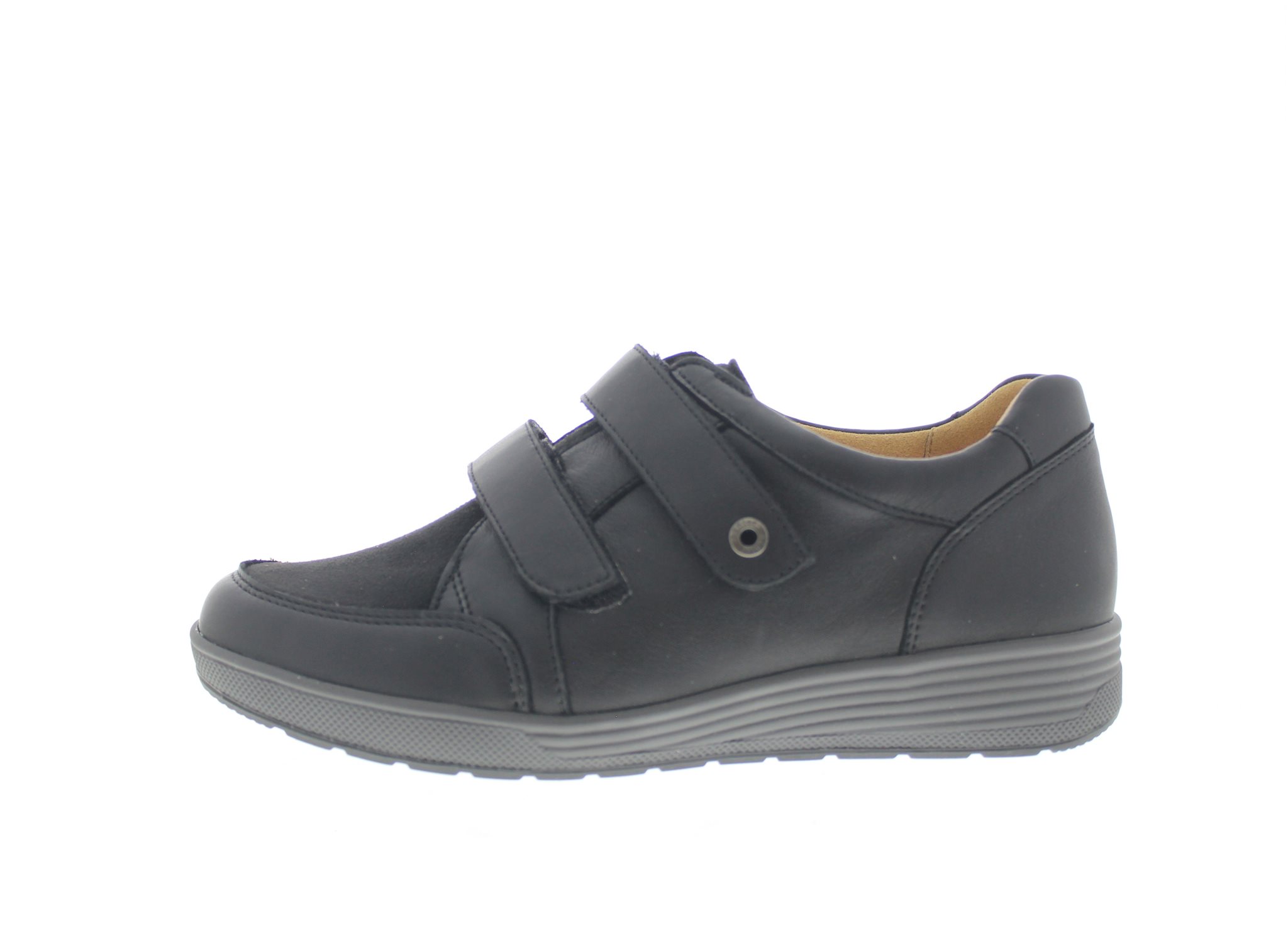 Ganter dames klittenbandschoen, model Klara uit de Sensitiv lijn. Zwart leer en suède met een zachte binnenvoering. De flexibele loopzool zorgt voor een neutrale en natuurlijke afwikkeling van je eigen voet. Wijdte K, geschikt voor de brede voet. Uitneembaar voetbed. Goed te dragen als dagelijkse schoen voor mensen met weinig voetklachten.