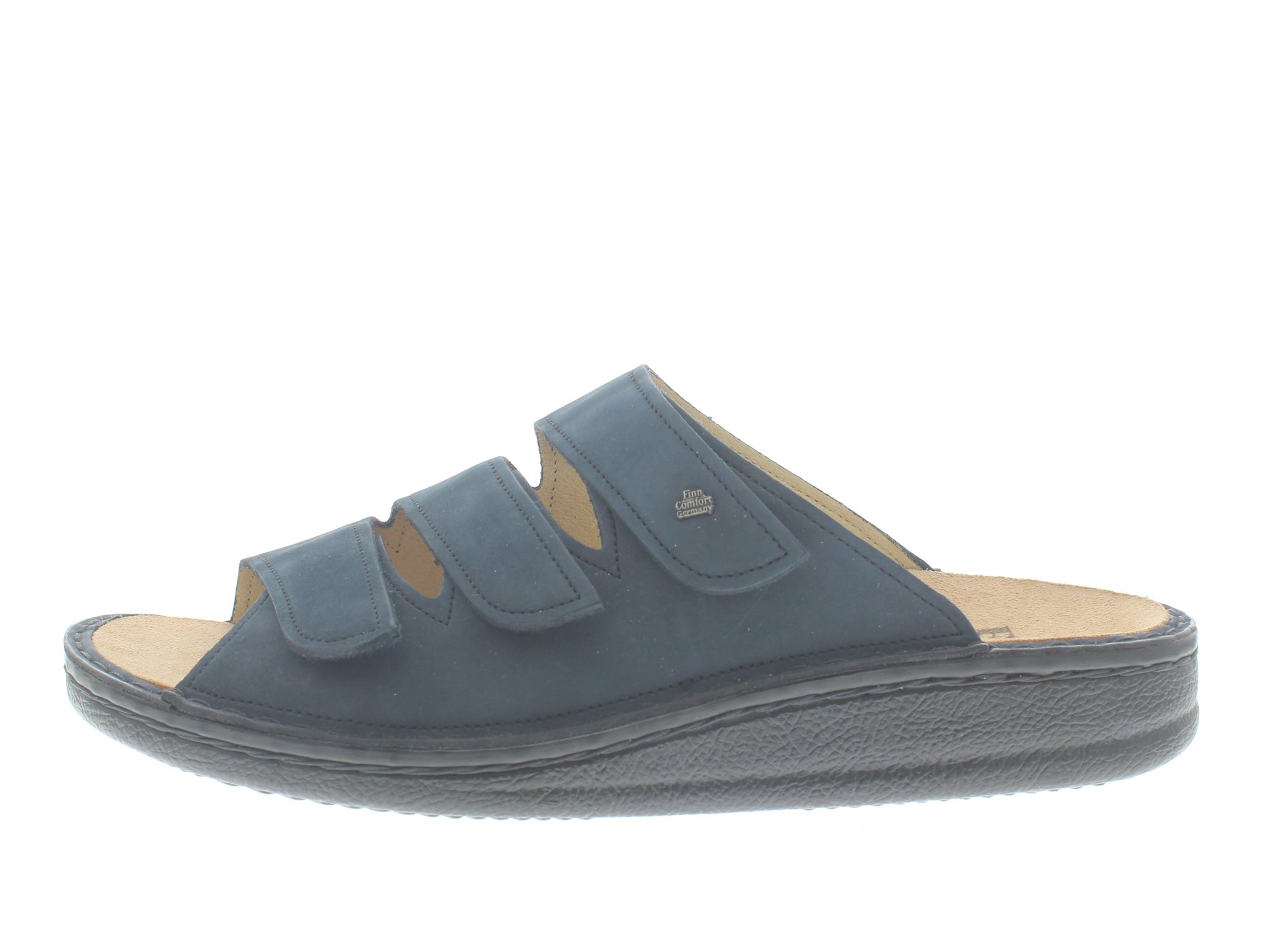 Finn Comfort dames slipper, model Korfu uit de Classic lijn. Voorzien van drie overslag klittenbandsluitingen met dichte flanken voor extra support. Blauw nubuck leer. Valt als een wijdte K, geschikt voor de bredere voet, maar door de verstelbare banden ook te dragen als een H wijdte. Deze leest heeft een natuurlijke pasvorm. Universeel model voor zowel dames als heren, afhankelijk van de kleur of maatboog. Uitneembaar ecologisch en anatomisch gevormde voetbed.
