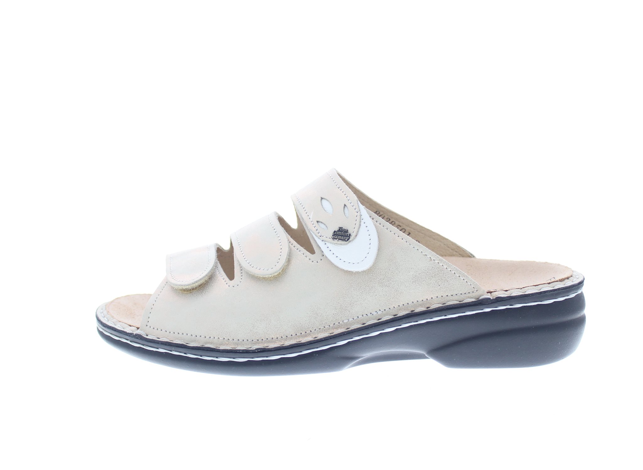 Finn Comfort dames slipper, model Kos uit de Classic lijn. Voorzien van drie verstelbare klittenbandensluitingen op de voet met dichte flanken voor extra support. Champagne nubuck met een metallic finish. Valt als een wijdte K, geschikt voor de iets bredere tot brede voet. Uitneembaar ecologisch en anatomisch gevormde voetbed.