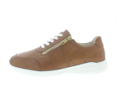 Solidus flexibele dames sneaker voor de voeten die weinig beperking dulden, model Kyle. Voorzien van een rits voor het instapgemak, zeer licht van gewicht met een heerlijk dempende EVA rubberen loopzool, en stevig rondom de enkel vanwege een toegespitste hielkap. Cognac glad leer. Wijdte K, geschikt voor de brede voet. Uitneembaar voetbed.