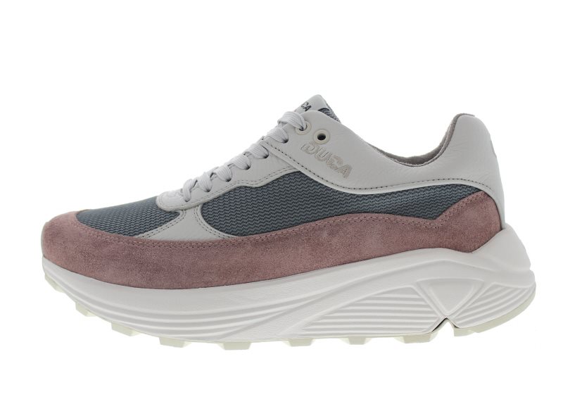 Duca dames casual/wandel sneaker, model Lecce Breathe. Uitgerust met een stugge Vibram onderwerk voor een aangenaam dynamisch en schokdempende afwikkeling. Aanbevolen bij een geïrriteerde peesplaat, hielspoor en gelimiteerde afwikkelklachten van de grote teengewricht. Grijs met oudroze suède/leer en mesh. Valt als een wijdte H, geschikt voor de iets gemiddelde voet. Uitneembaar voetbed. Hakhoogte 40mm. Hielheffing 15mm. Bescherm en verzorgadvies: Collonil Carbon Pro