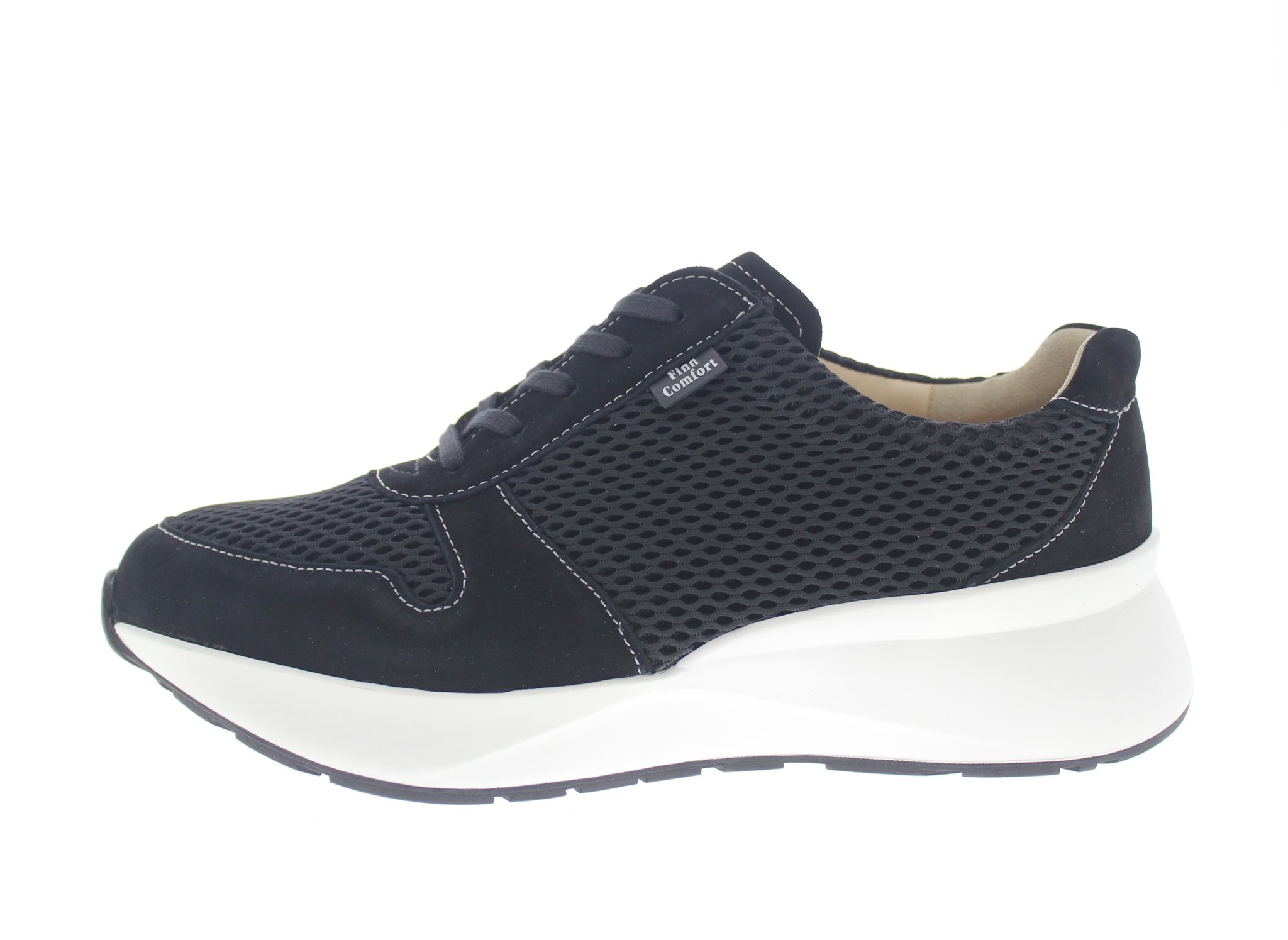Finn Comfort dames sneaker met een chunky afwikkelzool, model Leganes uit de CitySport lijn. Zwart nubuck gecombineerd met mesh. Valt tussen een wijdte H en K, geschikt voor de iets bredere voet. Uitneembaar ecologisch en anatomisch gevormde voetbed. De buitenzool heeft dempende eigenschappen en wikkelt heerlijk af, ideaal bij gevoelige voorvoeten en afwikkelproblemen. Ook geschikt bij een peesplaat ontsteking of bij een hallux limitus. Hakhoogte 40mm. Hielheffing 15mm. Impregneren met Collonil Carbon Pro voor het beste resultaat.