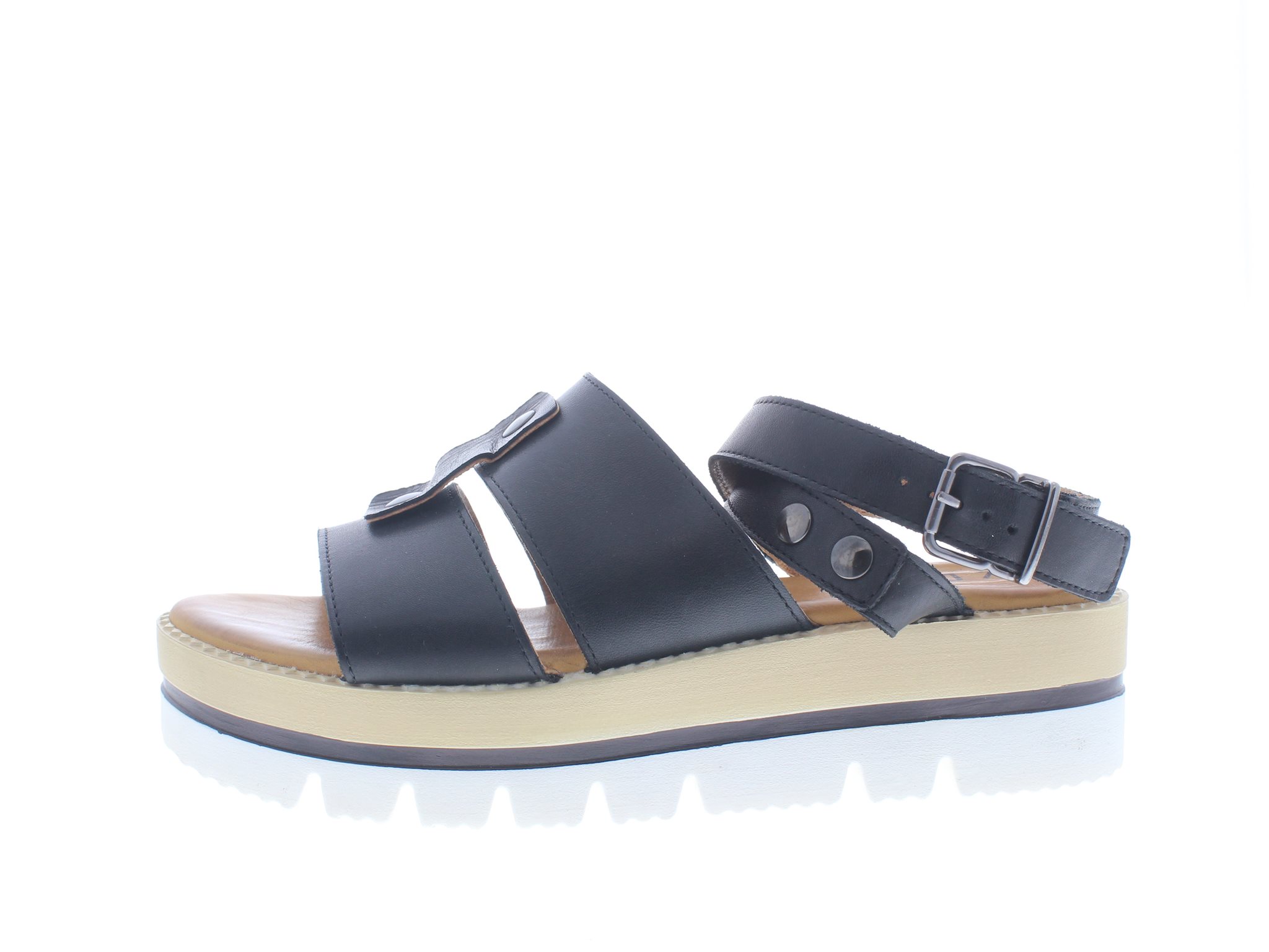 Roberto D’Angelo dames sandaal met plateauzool, hielsluiting met verstelbare gesp rondom de enkel, model Leon, zwart glad leer, valt als een wijdte G. Dit model heeft een vast voetbed met een dempende laag die je eigen voetvorm aanneemt.