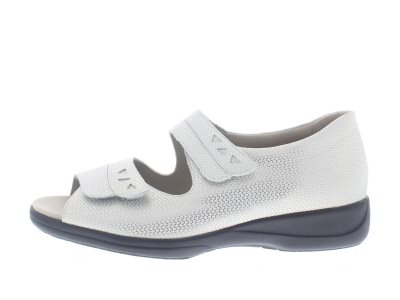 Solidus dames sandaal, model Lia, met twee klittenbandsluitingen op de voet en een dichte hiel voor extra stabiliteit. Wit leer met een metallic finish. Wijdte H, geschikt voor de iets bredere voet, uitneembaar voetbed.