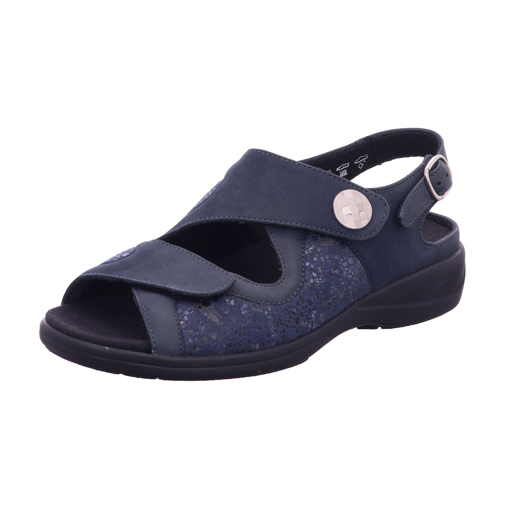 Dames sandaal van het merk Solidus. gemaakt met klittenbanden en een verstelbare hielband. De sandaal is in blauw leer en het voetbed is uitneembaar. De wijdte is H en de hakhoogte is 35mm. De hieldrop is 18mm.