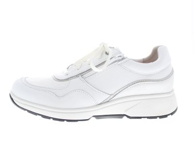 Xsensible dames sneaker, model Lima. Bestaat uit gecombineerde materialen, waaronder glad leer en neopreen (stretch) met witte hoofdkleuren. Stretchwalker onderwerk met antislipprofiel en enorm schokabsorberende kwaliteiten. Wijdte H, geschikt voor de iets bredere voet. Uitneembaar voetbed. Hakhoogte 45mm. Hielheffing 25mm.