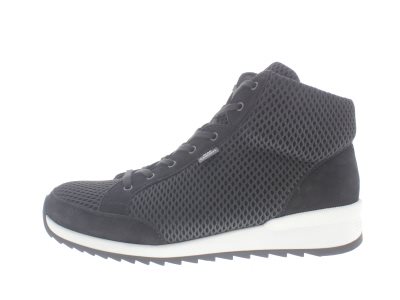 Finn Comfort casual dames bootie, model Linares uit de CitySport lijn. Voorzien van een lichte afwikkelzool met een stevige grip. Zwart nubuck gecombineerd met mesh. Valt als een wijdte H, geschikt voor de gemiddelde voet. Uitneembaar ecologisch en anatomisch gevormde voetbed.