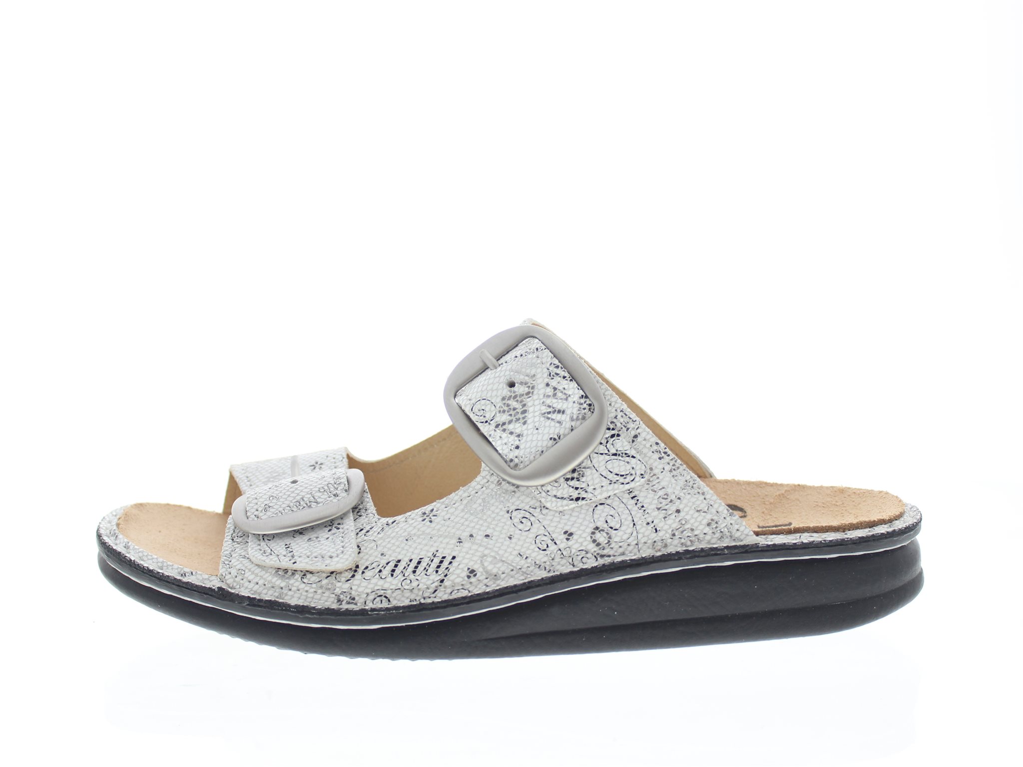 Finn Comfort dames slipper, model Lipari uit de FinnClassic lijn, wit multi glad leer met een slangenprent en verstelbaar met goudkleurige gespen, valt als een wijdte J, geschikt voor de normale tot iets bredere voet. Uitneembaar voetbed. Ook zeer goed te gebruiken als huis slipper.