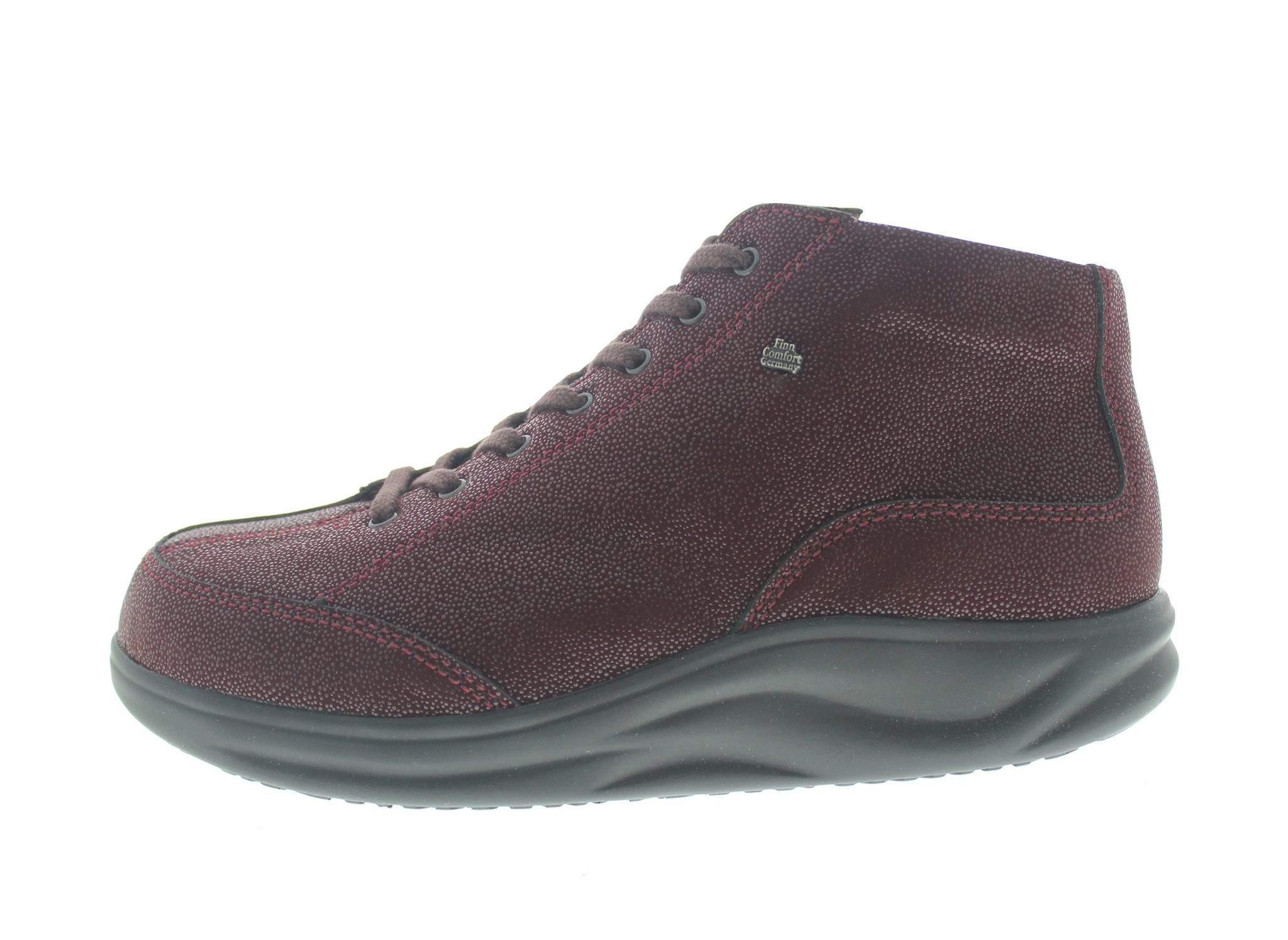 Finn Comfort enkelhoge dames sneaker, model Machida uit de super comfortabele Finnamic afwikkel-lijn, ideaal bij het bestrijden van hielspoor/peesplaat en voorvoet gerelateerde klachten (metatarsalgie/morton), en het verbeteren van de lichaamshouding om eventuele rugklachten te verlichten. Bordo leer. Valt tussen een wijdte H en K, geschikt voor de bredere voet. Voorzien van een mediale rits voor het aan- en uittrek gemak. Uitneembaar ecologisch en anatomisch gevormde voetbed.