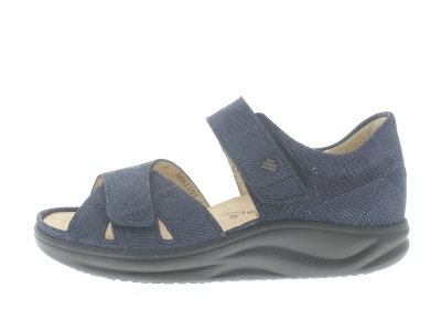 Finn Comfort dames sandaal, model Makuhari uit de Finnamic afwikkel lijn. Verstelbaar met twee klittenbandsluitingen en een dichte hiel voor extra support. Uiterst geschikt bij het ontlasten van hiel en voorvoet gerelateerde klachten. Blauw nubuck leer met een patroon en een metallic finish. Valt tussen een wijdte H en K, geschikt voor de iets bredere voet. Uitneembaar ecologisch en anatomisch gevormde voetbed.