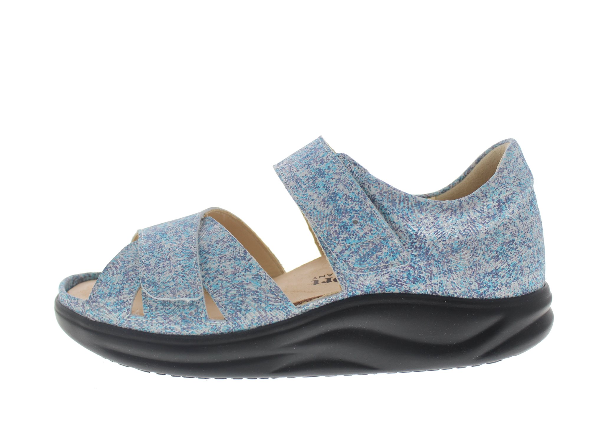 Finn Comfort dames sandaal, model Makuhari uit de Finnamic afwikkel lijn. Verstelbaar met twee klittenbandsluitingen en een dichte hiel voor extra support. Uiterst geschikt bij het ontlasten van hiel en voorvoet gerelateerde klachten. Blauw nubuck. Valt tussen een wijdte H en K, geschikt voor de iets bredere voet. Uitneembaar ecologisch en anatomisch gevormde voetbed.