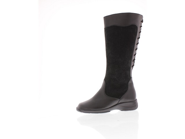 Kombi zwart glad- en nubuckleer. Wijdte: M voor de extra brede voet, verwisselbaar voetbed. Vetersluiting op de kuit zodat de kuitwijdte bijgesteld kan worden. Warm gevoerd met scheerwol. Uitneembaar voetbed.