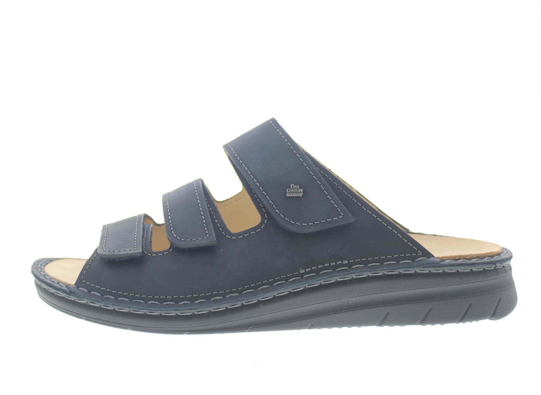 Finn Comfort heren slipper, model Mataro uit de Classic lijn. Blauw gevet leer, met dichte flanken voor extra support en drie verstelbare klittenbandsluitingen op de voet. Valt als een wijdte H, geschikt voor normale voet. Uitneembaar ecologisch en anatomisch gevormde voetbed.