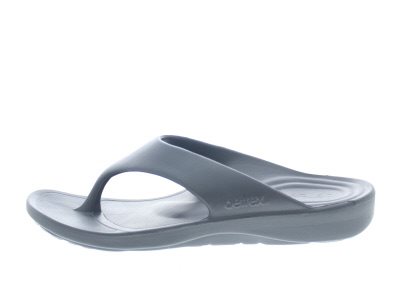 Aetrex heren teenslippers, model Maui Flips in een donkergrijze kleur. Aetrex slippers zijn speciaal ontwikkeld om je te voorzien van een goede steun en houding, daar waar een normale slipper ophoudt, en aan te bevelen voor het verlichten van peesplaat en hielspoor gerelateerde klachten. De slippers zijn uitgerust met een ingebouwde antipronatie blok en anatomisch gevormde voetbed, dat ervoor zorgt dat je niet met de enkels naar binnen knikt, dat namelijk pijn kan veroorzaken in de enkels, knieën, heupen en onderrug. De Aetrex slippers zorgen voor een soepele afwikkeling, dit allemaal gemaakt van een hoogwaardige kwaliteit polyurethaan dat heerlijk zacht aan je voeten zit en een maximale demping garandeert. Uiterst geschikt om te gebruiken als badslippers, op de camping, op het strand of gewoon bij het doen van je boodschappen. De breedte valt tussen een wijdte G en H. Geschikt voor de normale tot iets bredere voet.